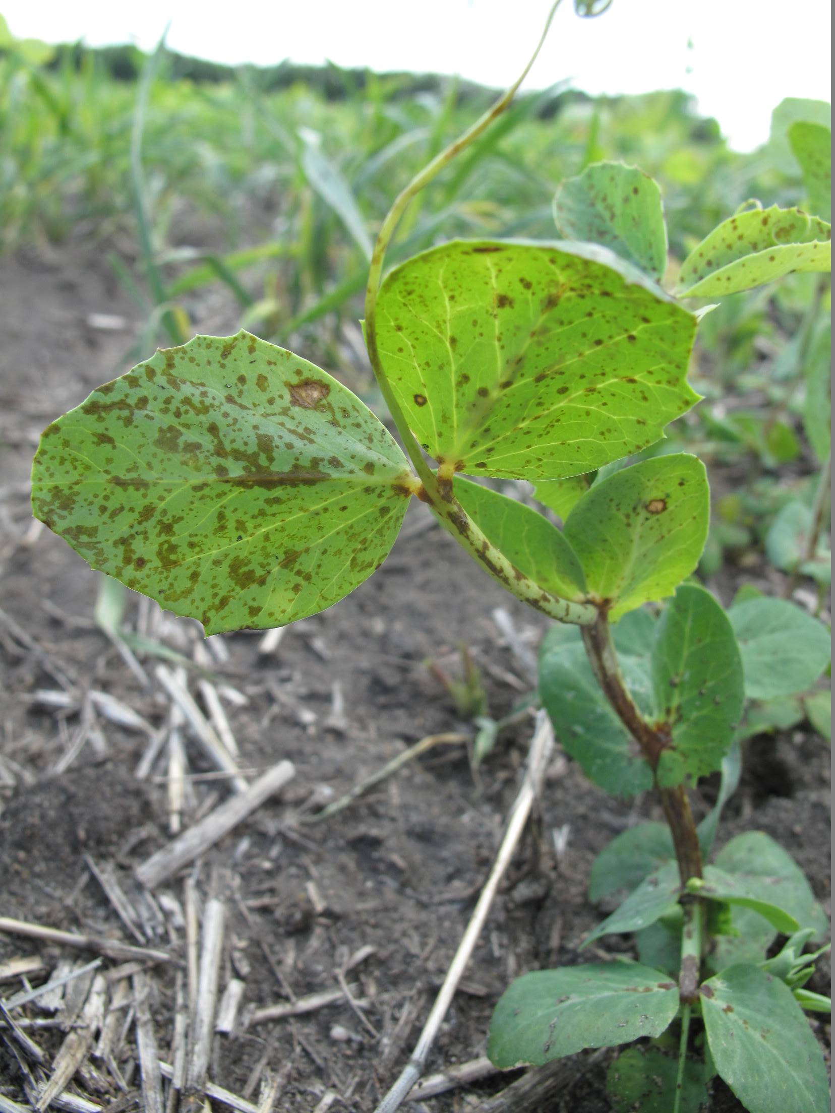 Поражаются листья, стебель и бобы, где развиваются темно-бурые, вдавленные пятна.
