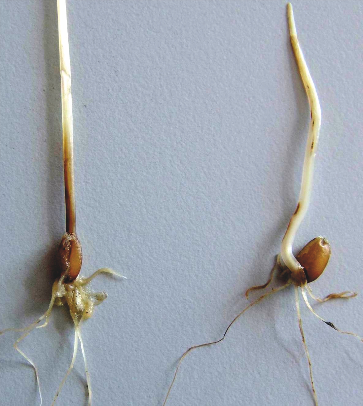 На колеоптиле, основании растений, первичных корнях образуются темные точки и