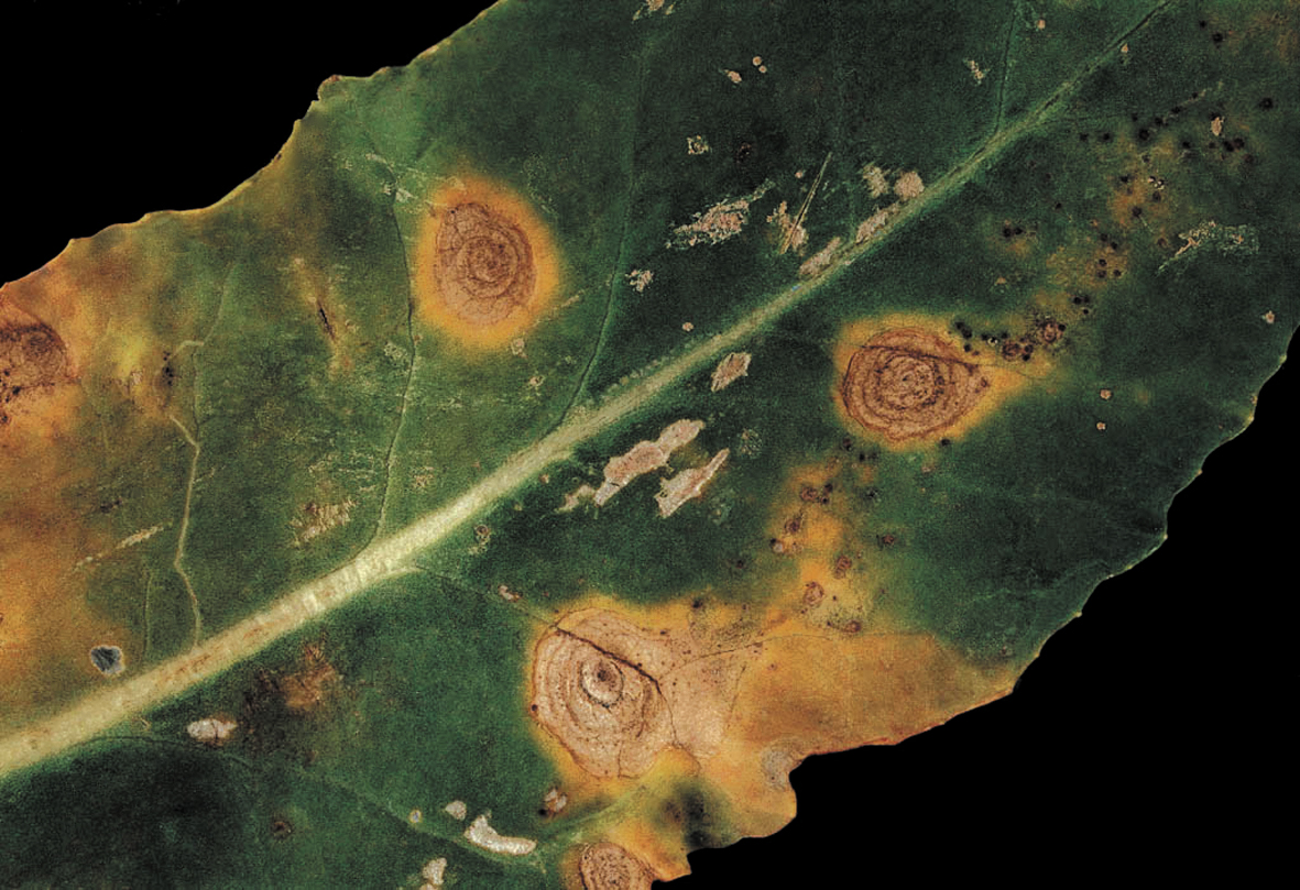 Проявляется на листьях в виде тёмно-коричневых или светло-серых округлых зональных